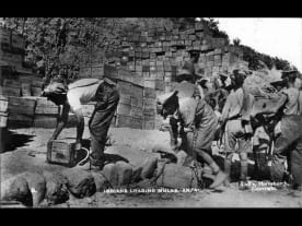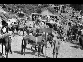 Indian troops loading mules at ANZAC Cove, Gallipoli, Turkey. Photographed by an unknown photographer in 1915. Powles family :Photographs. Ref: PA1-o-811-20-3. Alexander Turnbull Library, Wellington, New Zealand. http://natlib.govt.nz/records/22439277
