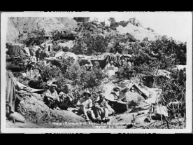 Indian bivouacs and soldiers on a hillside at Anzac Cove. Photographed circa 1915 by L E Tatton. Smith, A E W :Photographs taken during the Gallipoli campaign in 1915, particularly at Anzac Cove. Ref: PAColl-0063-04. Alexander Turnbull Library, Wellington, New Zealand. http://natlib.govt.nz/records/22730885