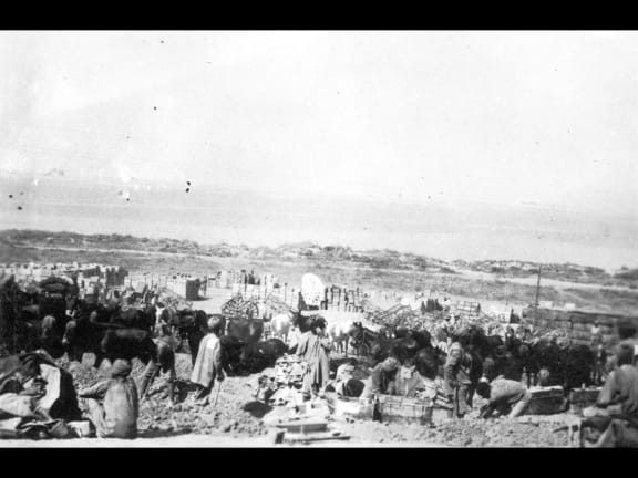 View of No 2 Outpost, Gallipoli, Turkey, with Indian soldiers and horses much in evidence. Carts and piles of stores can be seen in the background. Photographed by an unknown photographer in 1915. Denniston, George Gordon, 1885-1958 :Photograph albums relating to World War I including the Gallipoli campaign. Ref: PA1-o-863-02-6. Alexander Turnbull Library, Wellington, New Zealand. http://natlib.govt.nz/records/22757346
